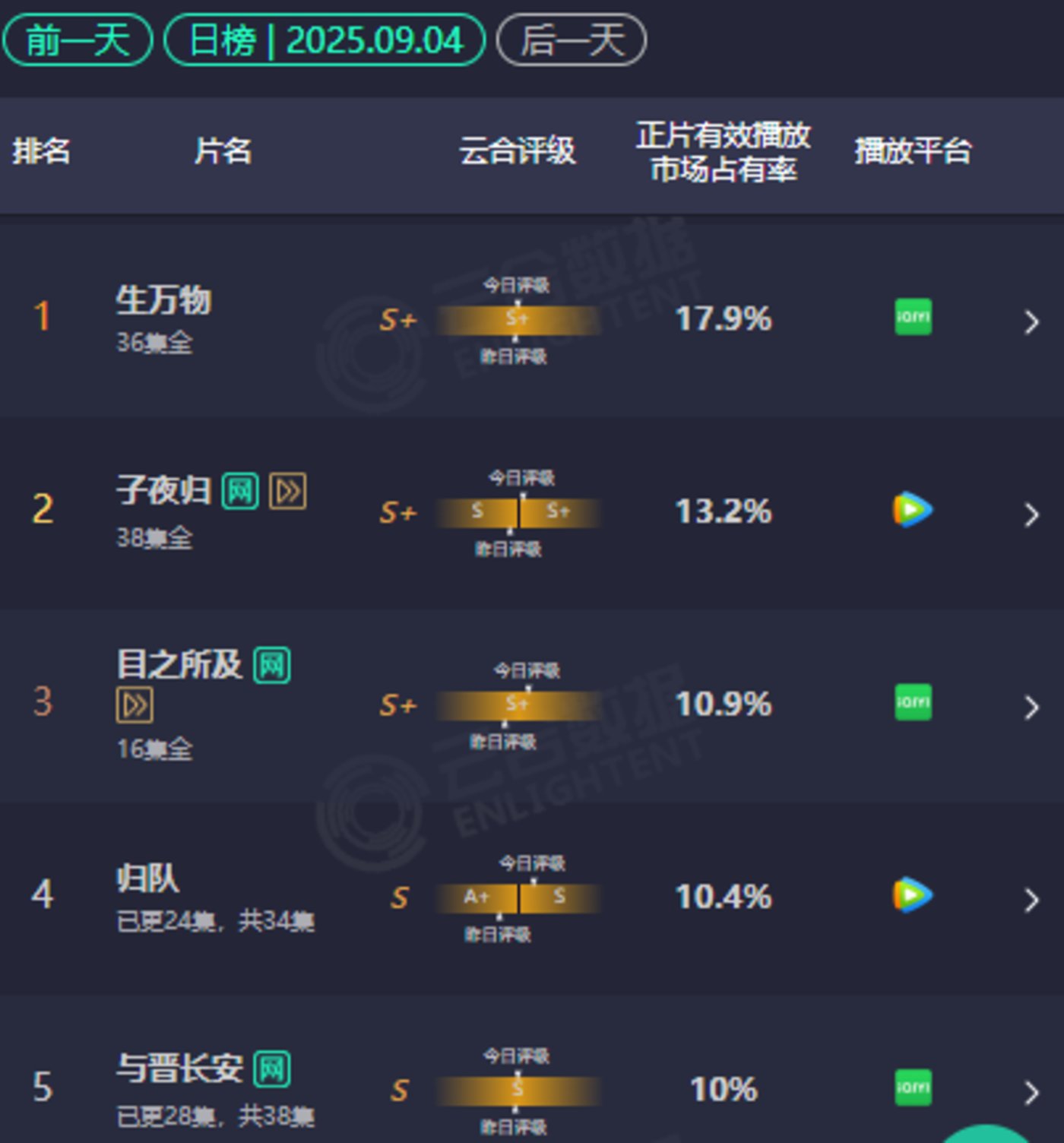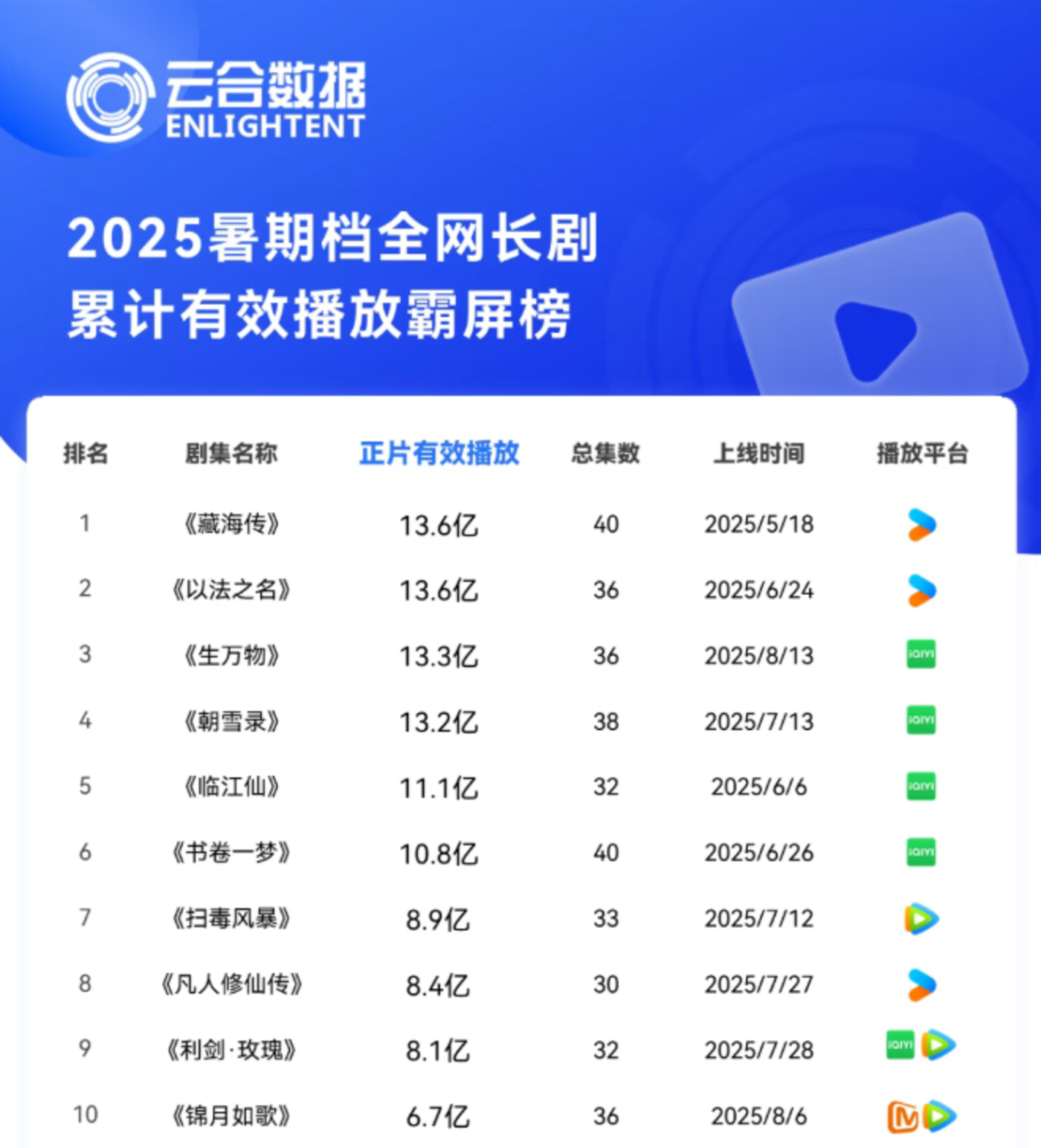 暑期档三大平台的竞争中,爱奇艺保持着领先半步的势头。云合长剧累计有效播放量排行榜前五中,《生万物》《朝雪录》《临江仙》 均为爱奇艺独播剧,排名前十中也有四部爱奇艺独播剧、一部爱腾联播剧,市场表现确实略胜一筹。