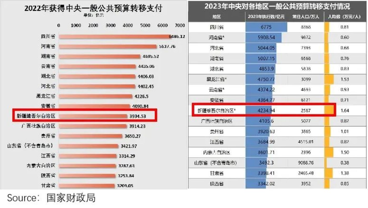 可以看到,作为国家大力扶持的安稳福地,中央财政对新疆的转移支付力度逐年加大。
