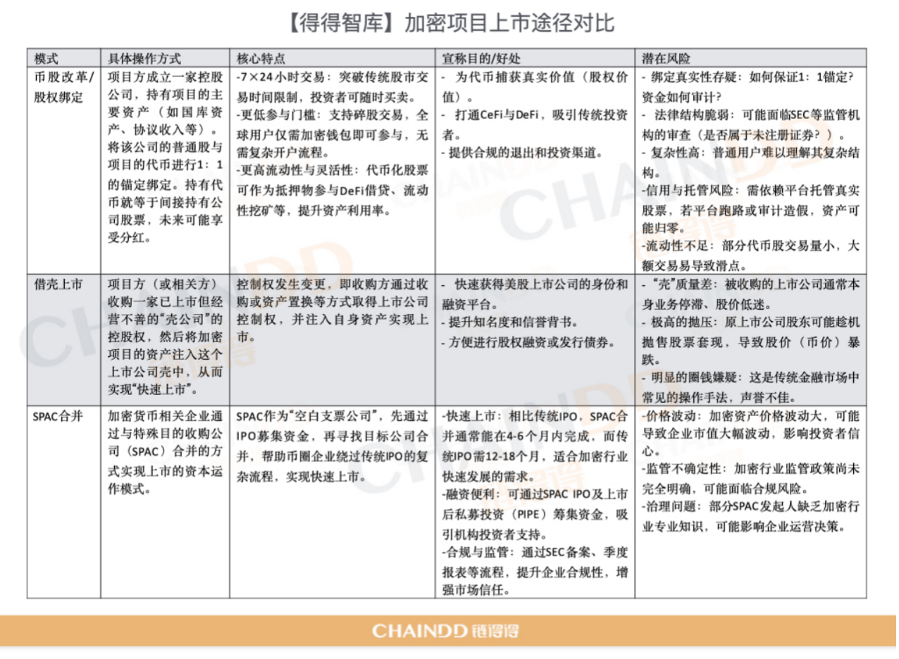 链得得旗下得得智库也对上述各种加密项目上市途径进行了如下对比。