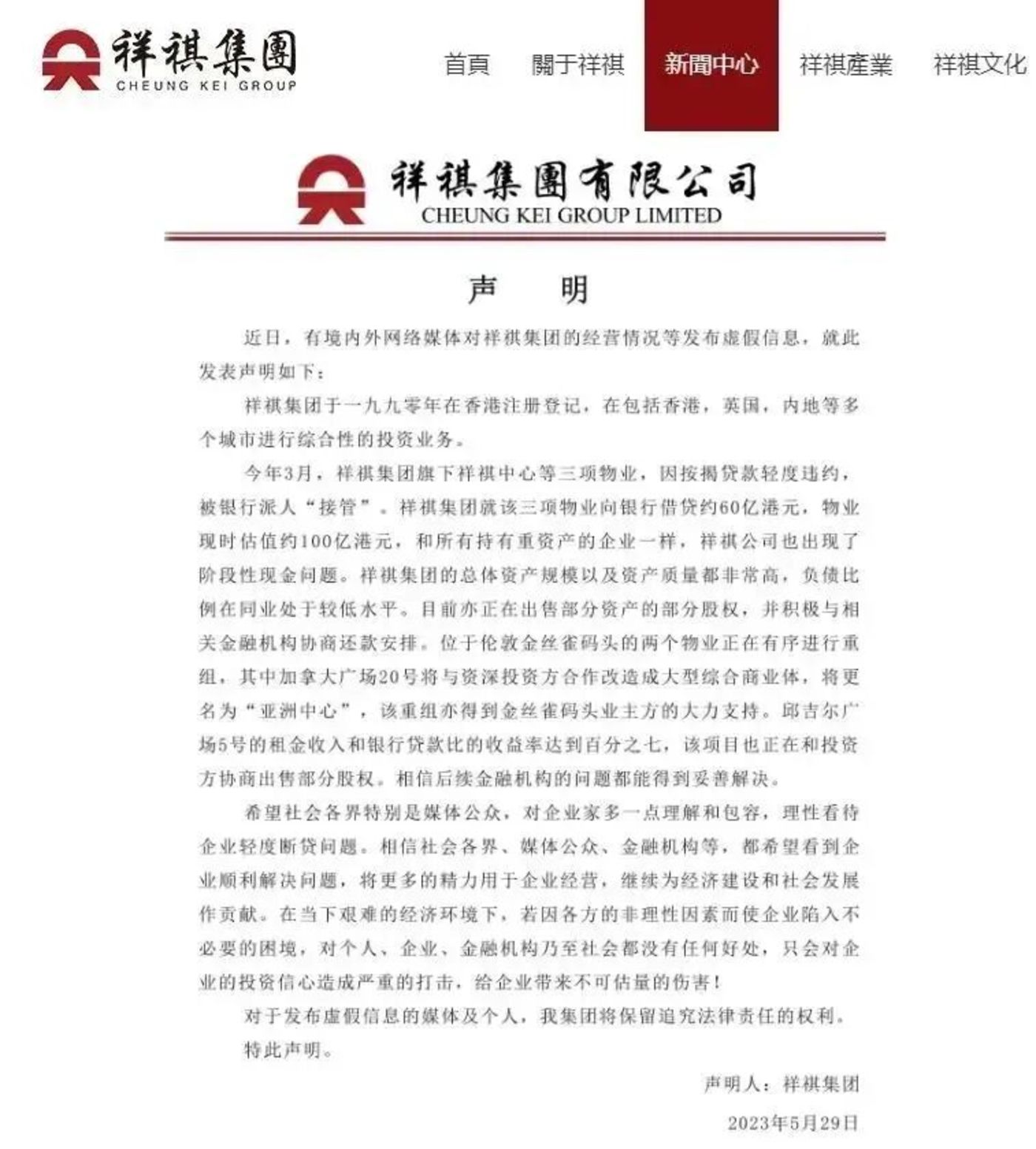 祥祺集团很快通过 「同心俱乐部」 公众号回应,承认 「因系列事件出现短暂现金流断裂」,但表示 「相信短时间内可妥善解决」。公司称,这三项核心物业最新估值约 98 亿港元,虽较疫情前下跌,但仍高于 50 亿港元贷款规模,负债率不足 60%。