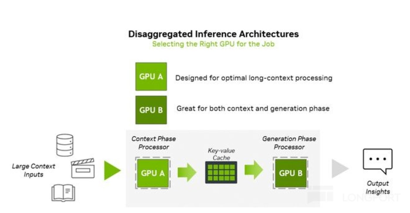 英伟达本次推出 Rubin CPX 的专用 GPU,主要针对于海量数据情况下,提升上下文阶段的速度。而在具体的 Rubin 体系中,通过 GPU+ 专用 GPU 的搭配,实现优化。其中 CPX 承担上下文阶段的工作,其中采用 GDDR7 内存,而不必要用 HBM 内存也能满足需求。而原有 Rubin GPU 仍负责生成环节。