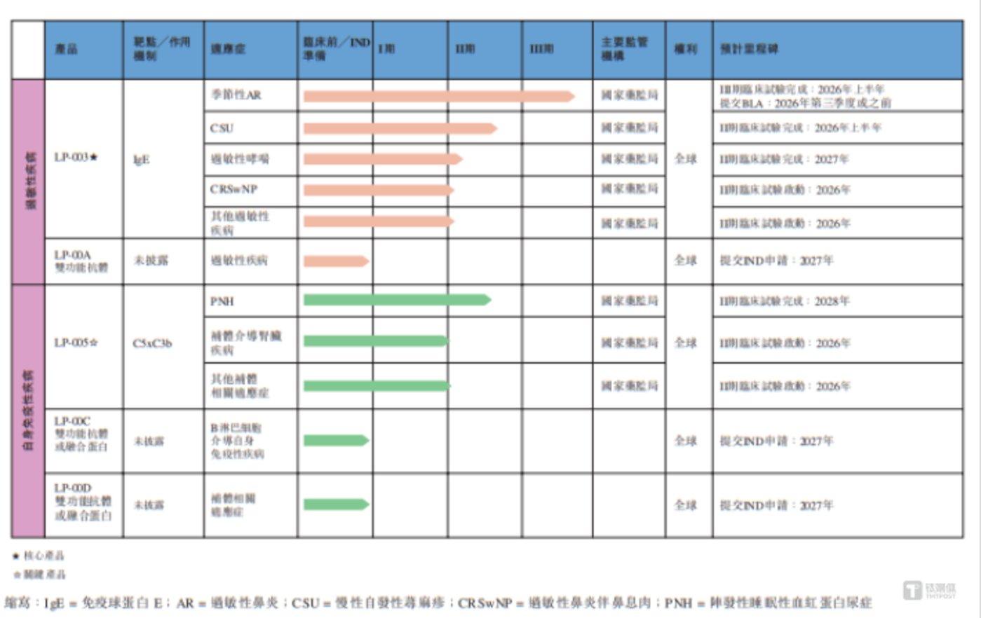截至招股说明签署日,天辰生物已开发了 LP-003、LP-00A 双功能抗体、LP-005、LP-00C 双功能抗体或融合蛋白、LP-00D 双功能抗体或融合蛋白等 5 种管线。