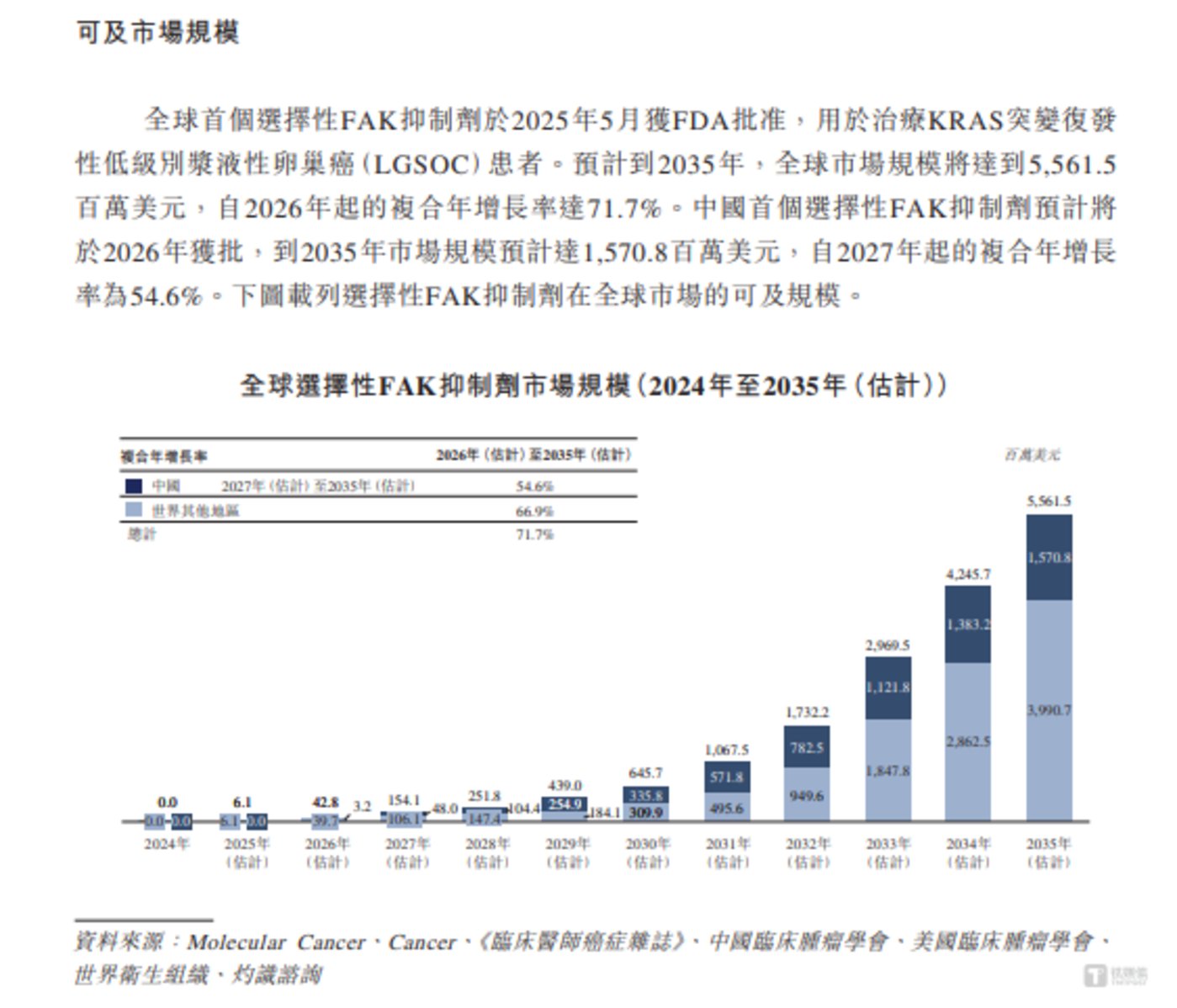 从市场前景上看,根据相关数据显示,全球首个选择性 FAK 抑制剂于 2025 年 5 月获 FDA 批准,用于治疗 KRAS 突变复发性低级别浆液性卵巢癌 (LGSOC) 患者。预计到 2035 年,全球市场规模将达到 5561.5 百万美元,自 2026 年起的复合年增长率达 71.7%。中国首个选择性 FAK 抑制剂预计将于 2026 年获批,到 2035 年市场规模预计达 1570.8 百万美元,自 2027 年起的复合年增长率为 54.6%。