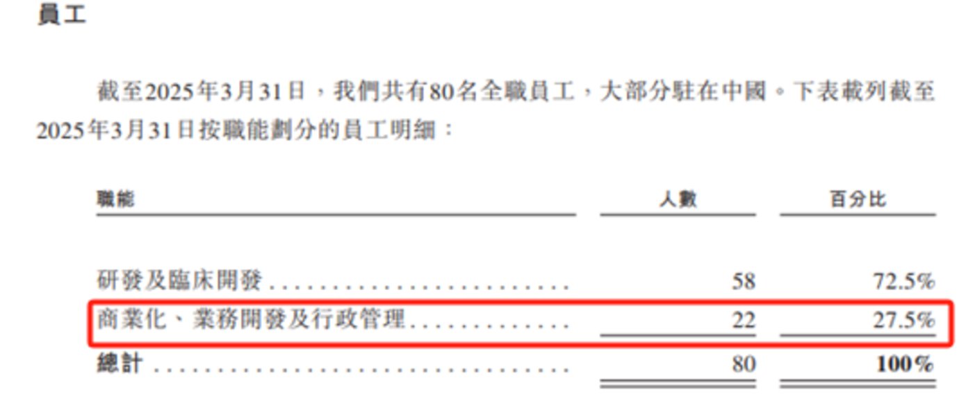 除此之外,应世生物招股申报稿中还存在一组令人费解的信息。招股说明书显示,截至 2025 年 3 月末,应世生物拥有 80 名员工中,其中 58 名为研发人员,22 名为商业化、业务开发及行政管理人员。