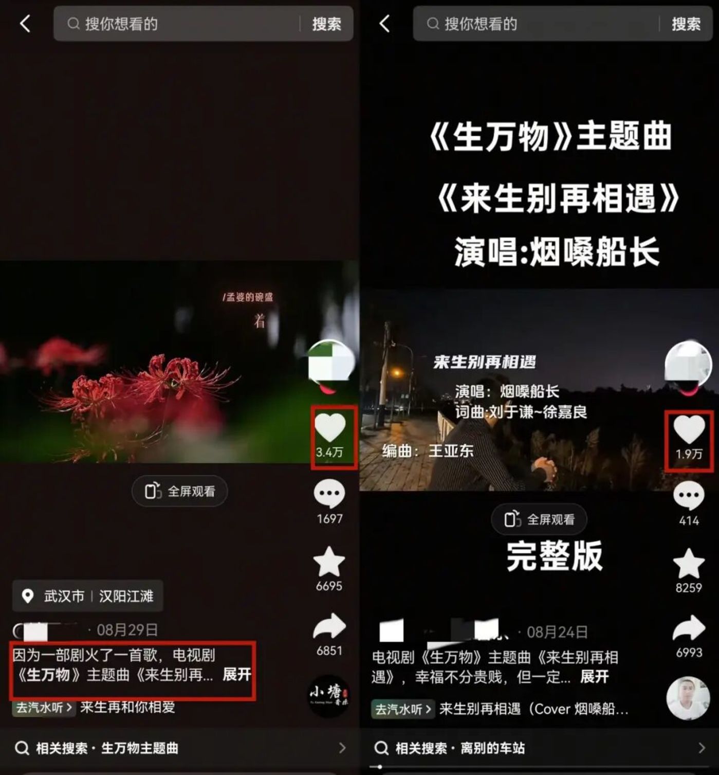 更为荒唐的是,伴随着电视剧 《生万物》 的大火,这首 《来生别再相遇》 在短视频平台上摇身一变成了 《生万物》 主题曲。各种用户自制的 MV 带上 #生万物、#一部剧带火一首歌等话题,动辄就斩获上万的点赞收藏。