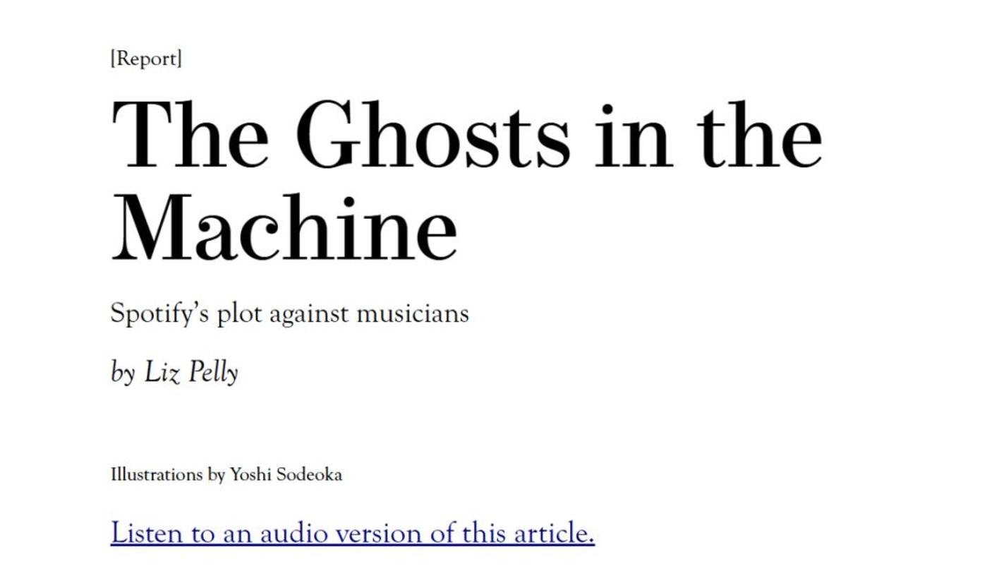 2025 年 1 月,期刊 《Harper's Magazine》 就撰文披露了 Spotify 的 「Perfect Fit Content」 计划。据悉,这一计划开始于 2017 年,Spotify 与多个供应商合作,供应商以极低的价格为 Spotify 提供多种类型的音乐,并且这些音乐的版权也永久转让给平台。随后,Spotify 会制造幽灵音乐人来发行这些歌曲,并整合到那些收听量颇高的榜单上。