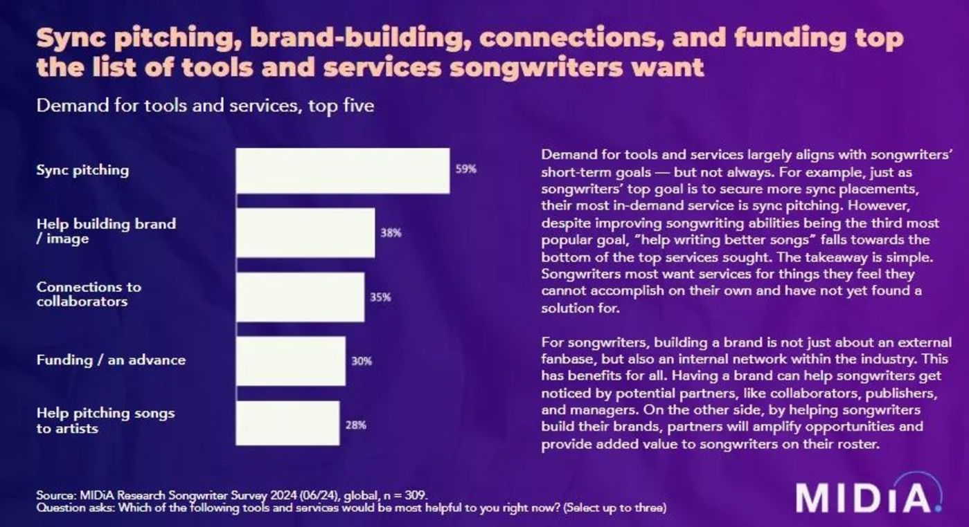 据 MIDiA 统计,59% 的创作者希望将作品推销给影视、广告、视频游戏等媒体,以获得同步权收益;38% 的创作者希望建立自己的品牌,提升他们在行业内的知名度和影响力;35% 的创作者表示需要更多的合作机会和人脉网络;30% 的创作者表达了对资金支持的需求,28% 的创作者表示需要将他们的作品推荐给更知名的艺人。