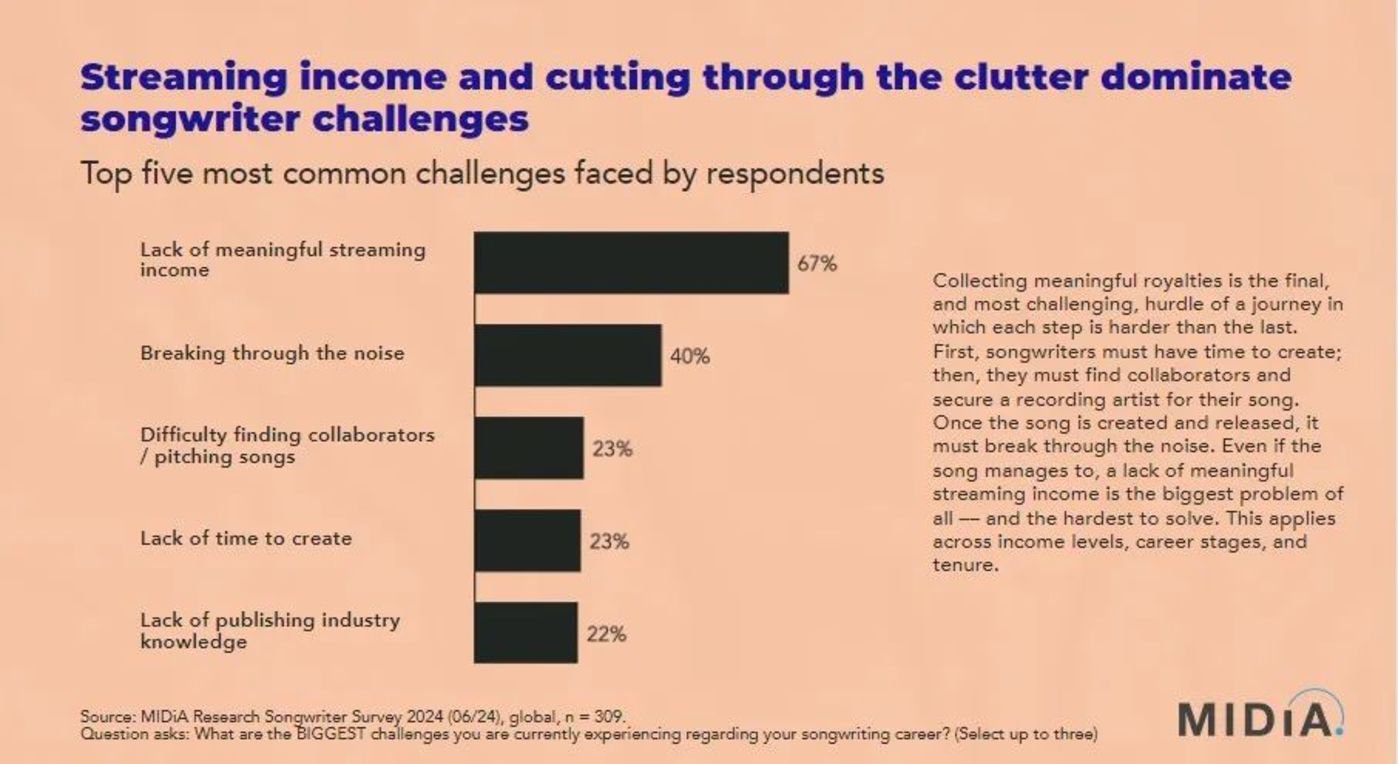 《报告》 显示,67% 的受访者表示流媒体收入不足以解决基本生活需求,40% 的人担心自己的作品会被淹没。23% 的创作者难以找到合作方、没有充分时间进行创作,22% 的人缺乏版权知识。