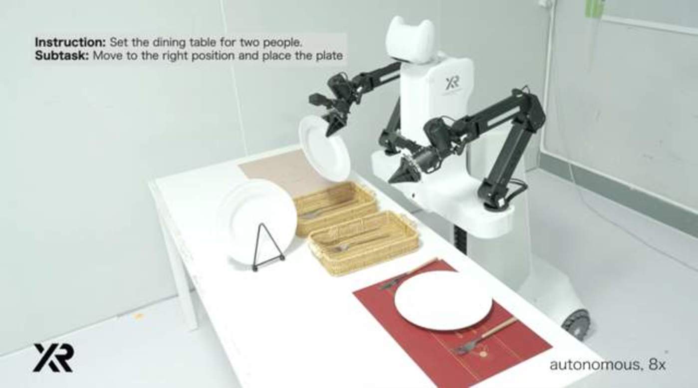 所以在收拾餐桌这个任务中,它执行起来并没有固定的顺序,说先做什么、后做什么,都是在一个长程任务里面,把各种子任务给穿插起来。人其实很难划分每个任务的边界是什么,这种任务就得靠模型端到端自主去决策、实时去规划,把整个任务完全做完的。