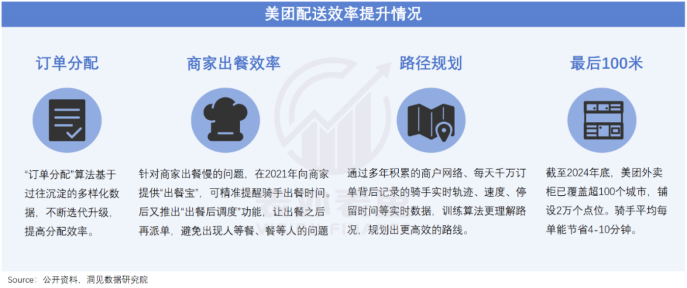 这需要很长时间的积累。美团外卖运营上的动作,从 「订单分配」 算法不断迭代,到推出 「出餐宝」 提醒骑手出餐时间,再到铺设 100 个城市 2 万个点位的外卖柜,目的不外乎挤掉水分,通过系统能力释放配送效率。