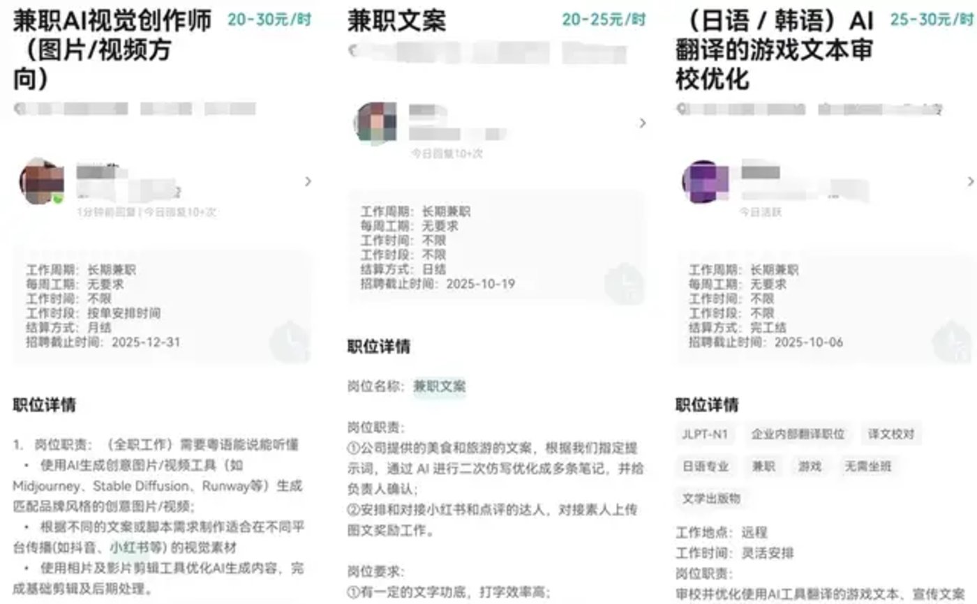 打开 BOSS 直聘、前程无忧等平台,都能搜到大量 AI 兼职文案、AI 设计、AI 小红书编辑、AI 美编等岗位信息,工作要求大同小异,大多数根据提示词、甲方需求用 AI 生成简单内容,甚至一些职业门槛较高岗位——如词曲创作、视频编导、营销方案策略等,也都有 AI 相关兼职。