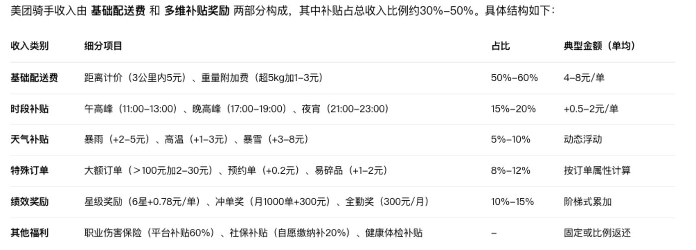 于是美团一边给骑手发包括基础配送费、时段补贴、天气补贴、特殊订单、绩效奖励在内的各种激励,刺激骑手之间竞争抢单去跑,