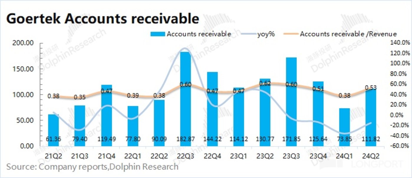 ①应收帐款:歌尔股份 2024 年第二季度应收帐款 111.8 亿元,同比下滑 14.5%。从应收帐款/营业收入指标看,歌尔股份本季度为 0.53,维持在相对合理水位。