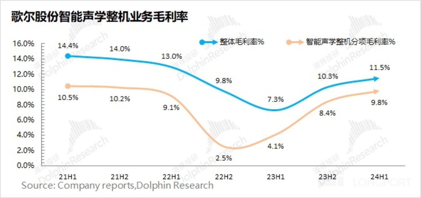 歌尔股份智能声学整机业务毛利率在 2024 年上半年回升至 9.8%,同比提升 5.7pct。随着出货量及产能利用率的回升,公司智能声学整机的毛利率逐渐修复。