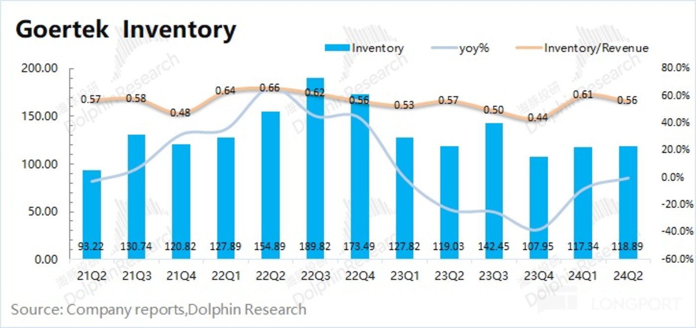 ②存货:歌尔股份 2024 年第二季度存货 118.9 亿元,同比下滑 0.1%。从存货/营业收入指标看,歌尔股份本季度为 0.56,保持相对平稳。