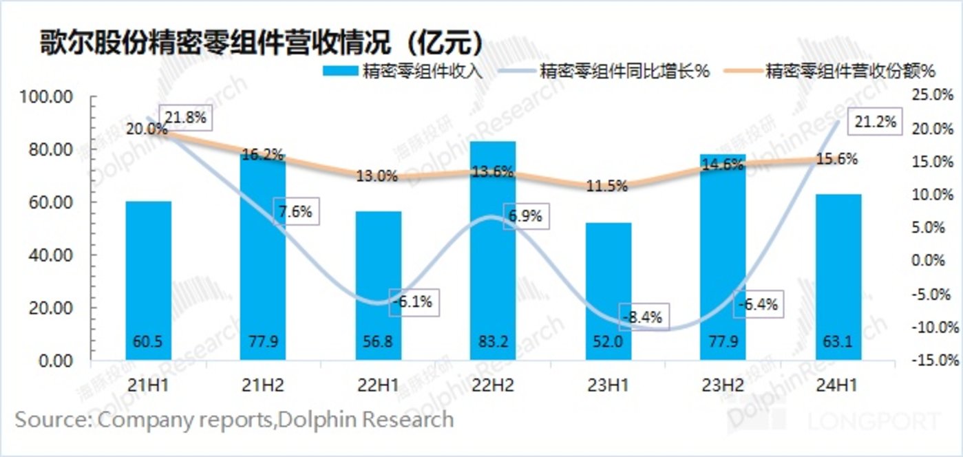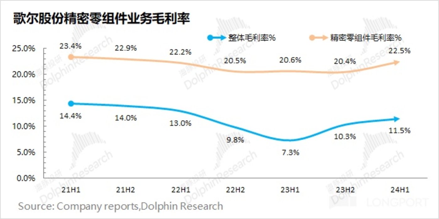 歌尔股份精密零组件业务 2024 年上半年毛利率为 22.5%,同比提升 1.9pct。公司精密零组件毛利率继续稳定在 20% 上方。