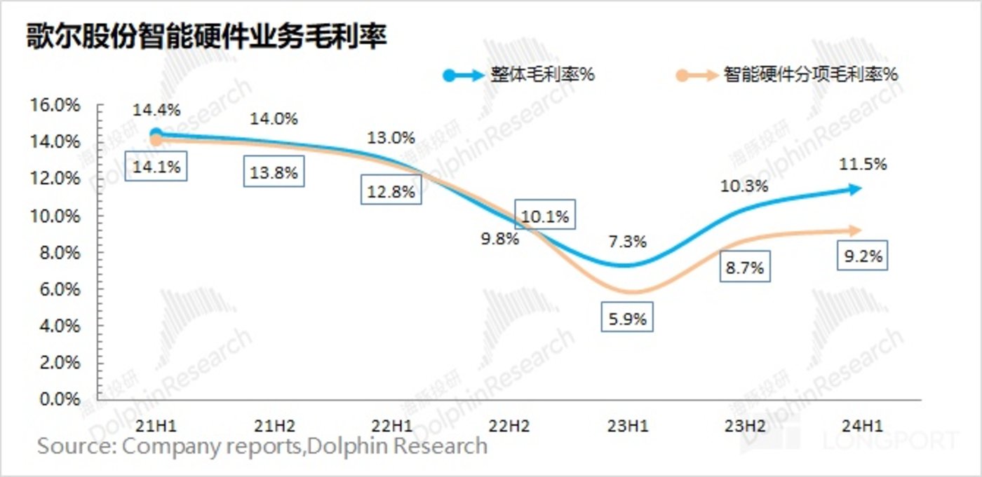 歌尔股份智能硬件业务 2024 年上半年毛利率实现 9.2%,同比提升 3.3pct。虽然业务收入仍在下滑,但毛利率已经从低谷有明显的回升。