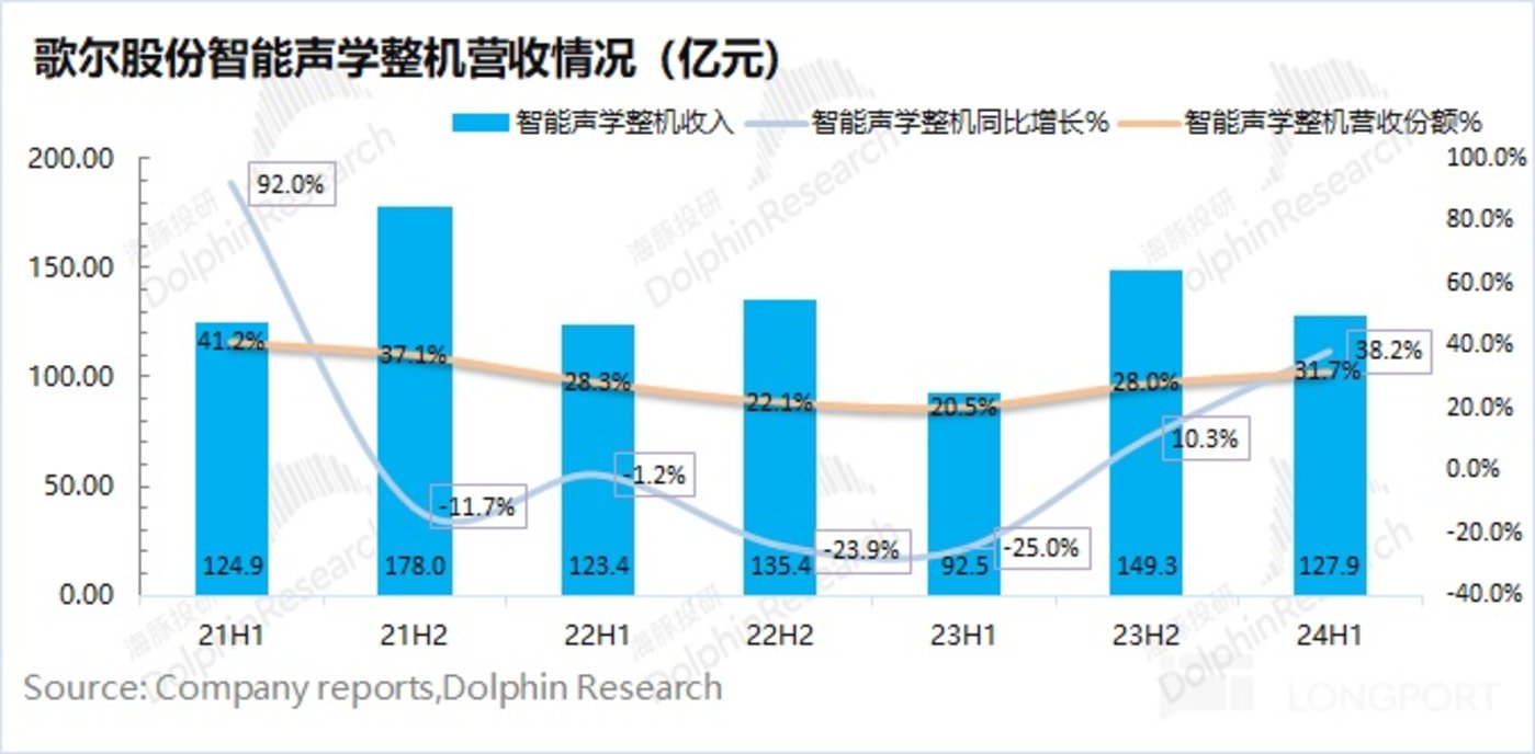 歌尔股份智能声学整机业务 2024 年上半年实现收入 128 亿元,同比增长 38.2%。歌尔股份的智能声学整机业务主要仍是以苹果及安卓厂商的 TWS 产品为主。