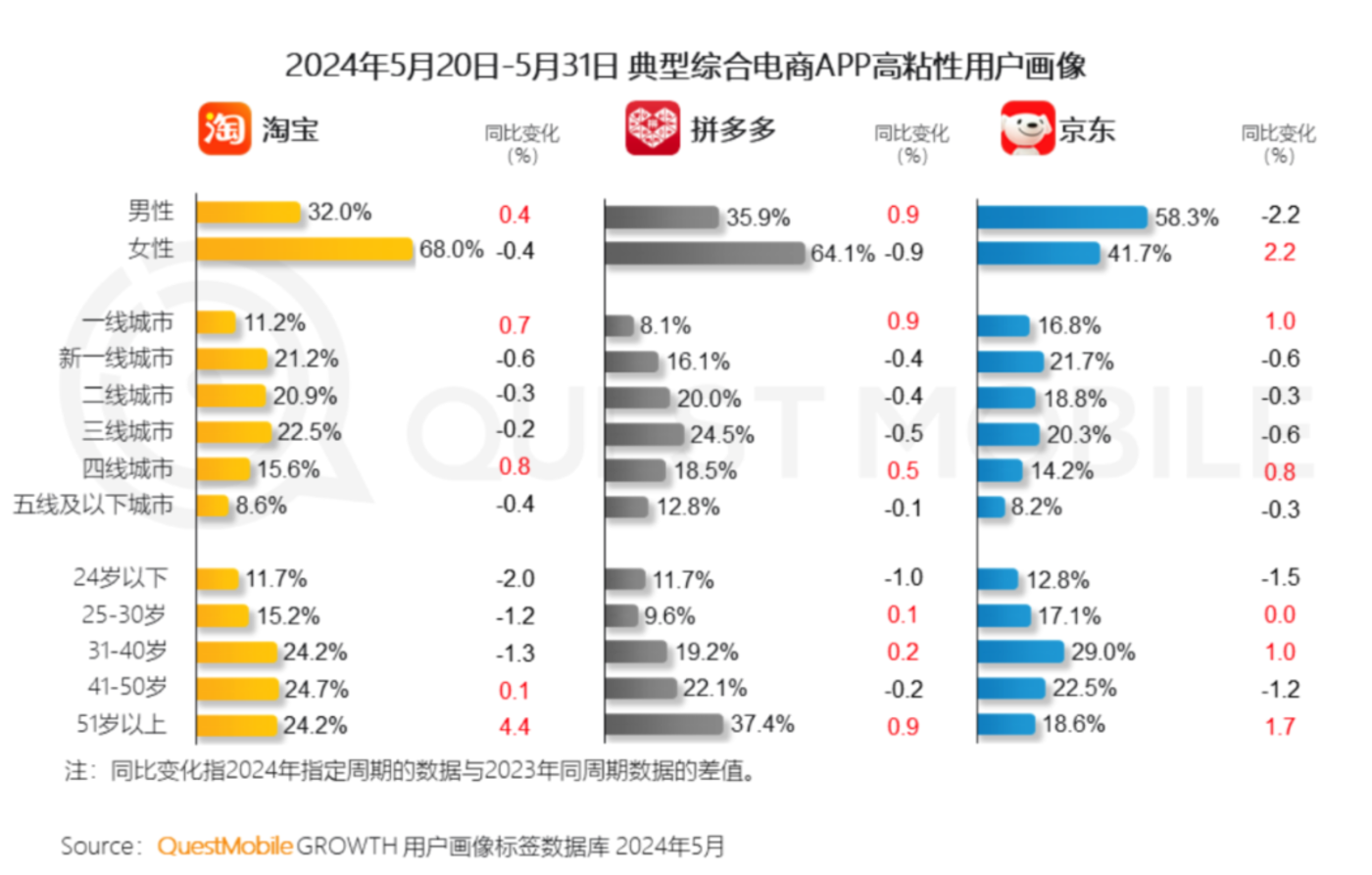 对比而言,QuestMobile 披露的数据显示,2024 年 5 月下旬,拼多多二线及以下城市用户占比高达 75.8%,并且 41 岁以上用户占比高达 59.5%,大部分用户位于低线城市,并且年龄偏大。这些用户天然追求极致低价商品。拼多多财报显示,其售卖的商品平均客单价仅为 40 元左右。