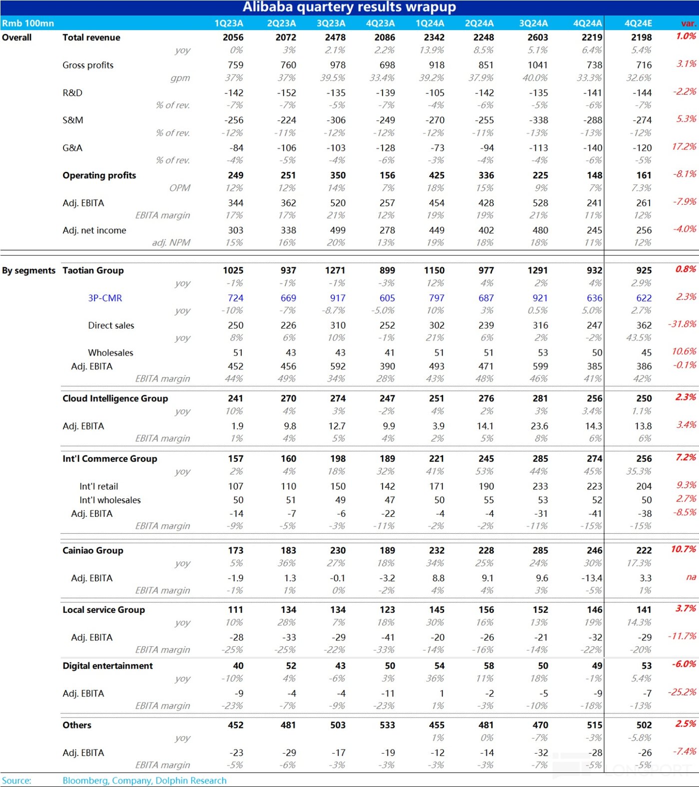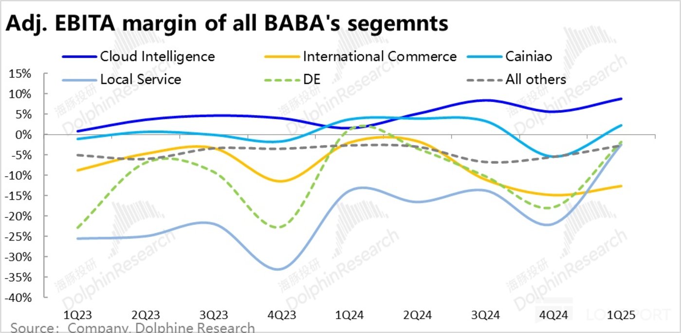 和海外业务发展高度绑定的菜鸟,本季伴随着国际业务的减速,收入同比增速同样是大幅放缓约 14pct 到 15.7%,放缓幅度和 AIDC 板块接近。但让人惊喜的是,菜鸟本季度的 adj.EBITA 直接从上季的亏损 13 亿,直接转正为盈利 6.2 亿,大幅好于市场仍预期的 2.5 亿亏损。同样是体现了转向精细化运营后,物流板块的 UE 明显改善。