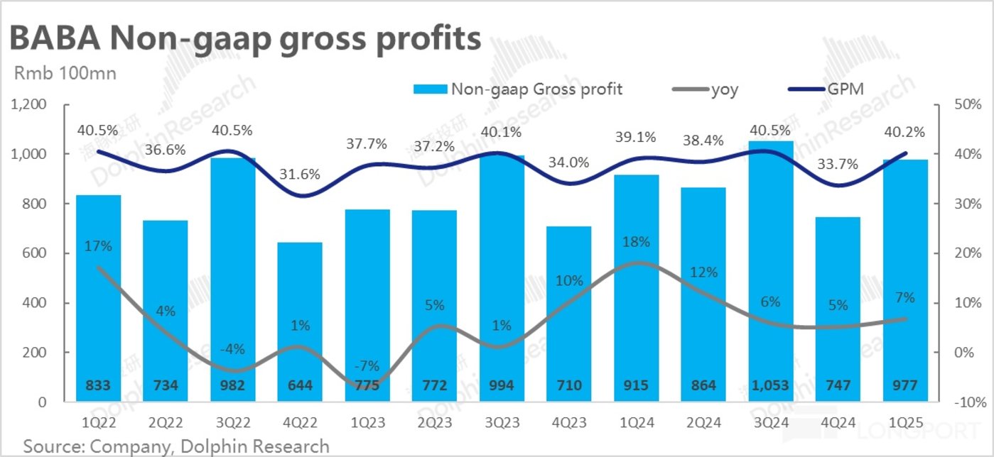 先前调整架构和财报口径后,自营零售仅保留了天猫超市、天猫国际等核心线上自营业务。本季自营零售收入同比负增了 9.5% 到 273 亿,比市场预期低整整 16%。如此大幅的收入缩窄,显然不可能至少宏观消费较弱足以解释,必然有公司主动收缩的因素。据公司解释部分原因是公司主动清退了部分消费电子和家电的自营业务,转而更侧重于日用、杂货等。新管理层入主后确实表现出清理重资产自营业务的倾向,但此次主动收缩的副作用可能有些过大了。