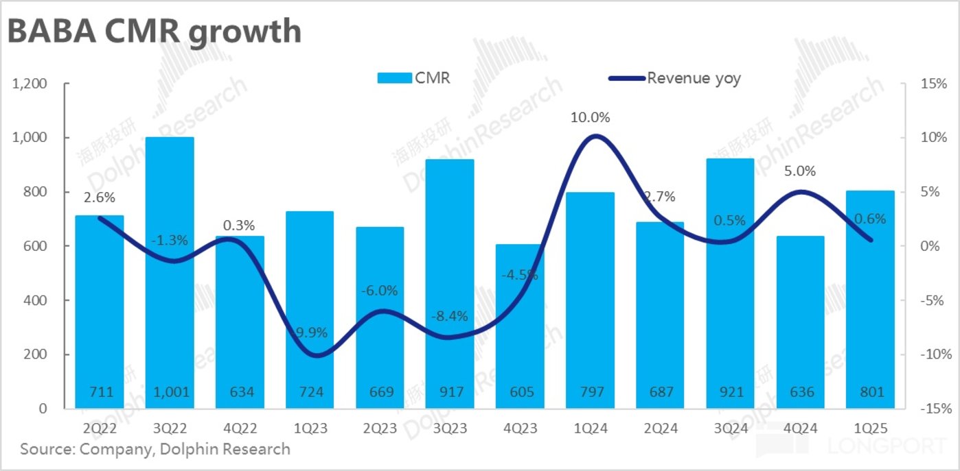 本季度因为较弱的社零数据,市场对淘天增长的预期也相当保守,众多卖方对 CMR 的增速预期只放在 3% 上下。而实际情况是,公司披露本季订单量的增速到双位数,GMV 增长则为高个位数,这两个指标都还算不错,但问题是本季度的国内零售客户管理收入 (CMR) 仅同比增长了 0.6%,比本就保守不足 3% 的预期还要低,这无疑是一个比较重大的 miss。