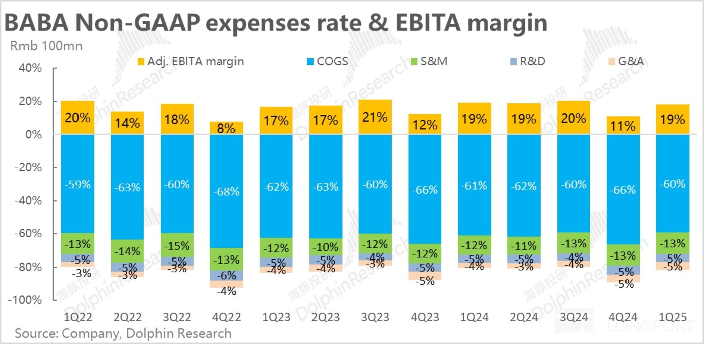 成本和费用的变动如何?首先,本季度阿里剔股权激励后的毛利率为 40.2%,相比去年同期提升了 0.9pct。在阿里逐步放弃低质资产/业务,各子公司减亏提效的情况下,集团整体的毛利率中期内应当会呈现持续改善的状态。