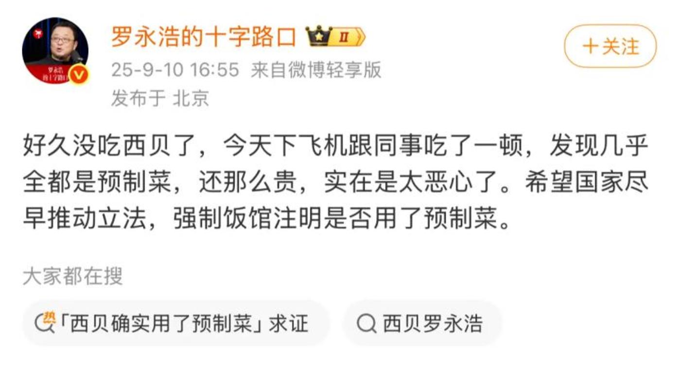 一夜之间,罗永浩、连锁餐饮品牌西贝莜面村 (以下简称 「西贝」) 和预制菜一起承包了微博热搜。