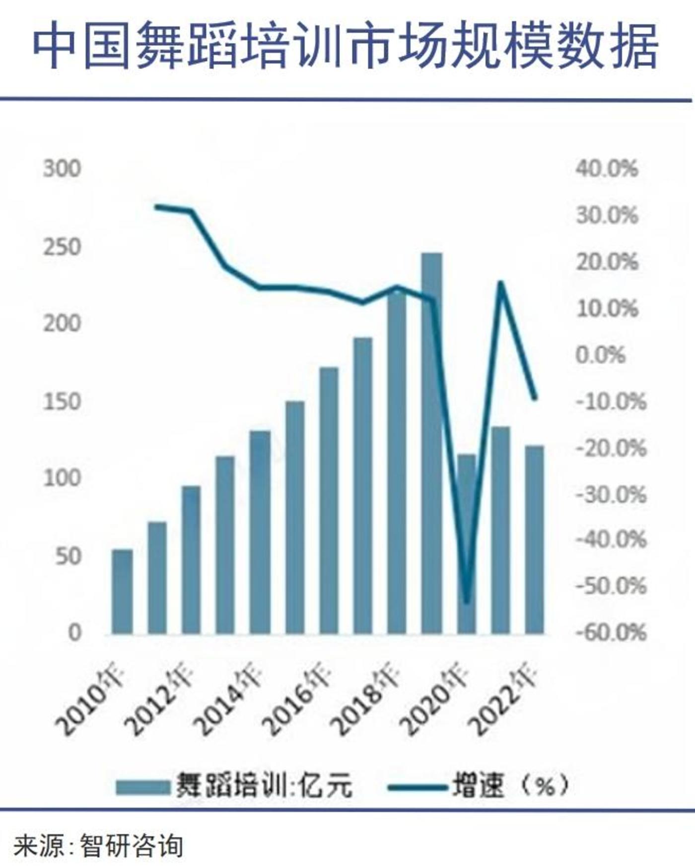 舞蹈培训市场的收入波动证明了这一点。2022 年,舞蹈市场的规模为 122.7 亿元,已经较 2020 年之前断崖式下降,然而到了 2023 年市场也始终没有迎来复苏。据相关机构预测,2023 年的舞蹈培训规模继续下降到了 120 亿元左右。在这种情况下,舞室、瑜伽馆、健身馆们的跑路并非偶然。