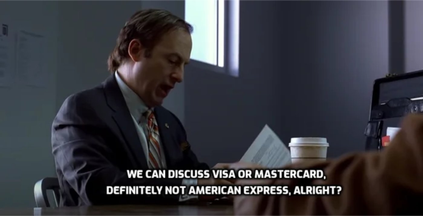 图注:美剧 《绝命毒师》 也曾调侃过运通的高收费,索尔古德曼明确表示不收运通卡。