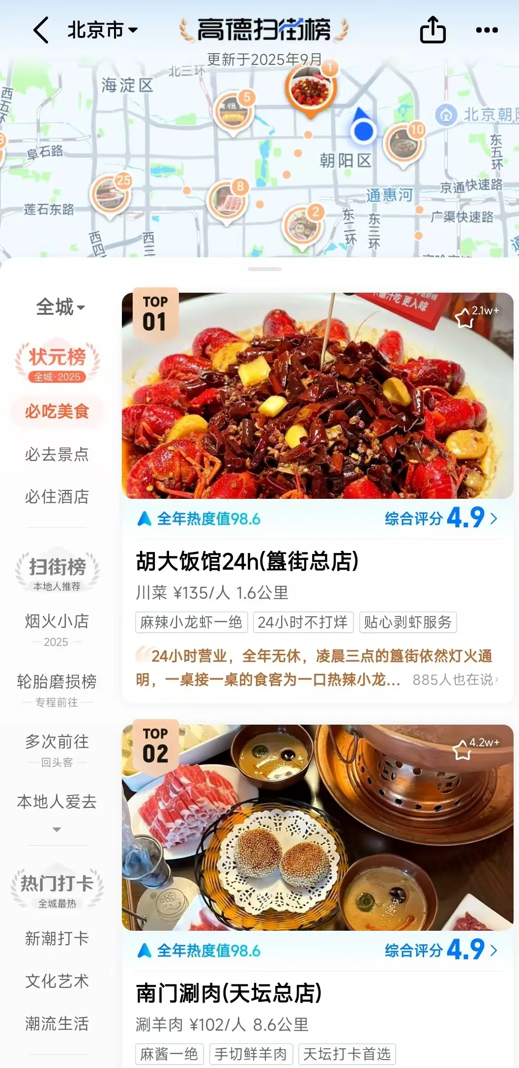 结果就是发布了对标美团大众点评榜单的“ 高德扫街榜”,对商家进行综合评分、排名,涵盖美食、景点、酒店等多种业态。