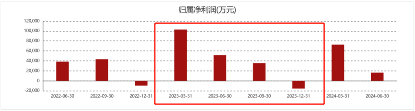 拉长时间线会发现,汤臣倍健 2023 年单季度归母净利润持续下滑,四季度直接出现了 1.55 亿元的亏损。