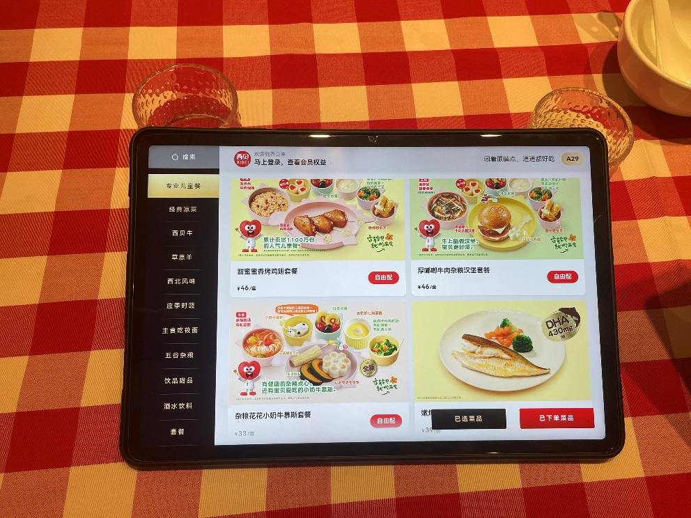 值得一提的是,据锌刻度观察,现场绝大多数的食客组合都是以家庭为单位,核心围绕着 2 至 15 岁左右的儿童、青少年。这与西贝门店的布置、服务与广告标语高度契合,从桌面提供的 babycare 联名纸巾、特意布置的儿童用餐区到菜单中单独列出的“ 专业儿童餐” 板块,皆体现出西贝是一家“ 亲子友好餐厅”。