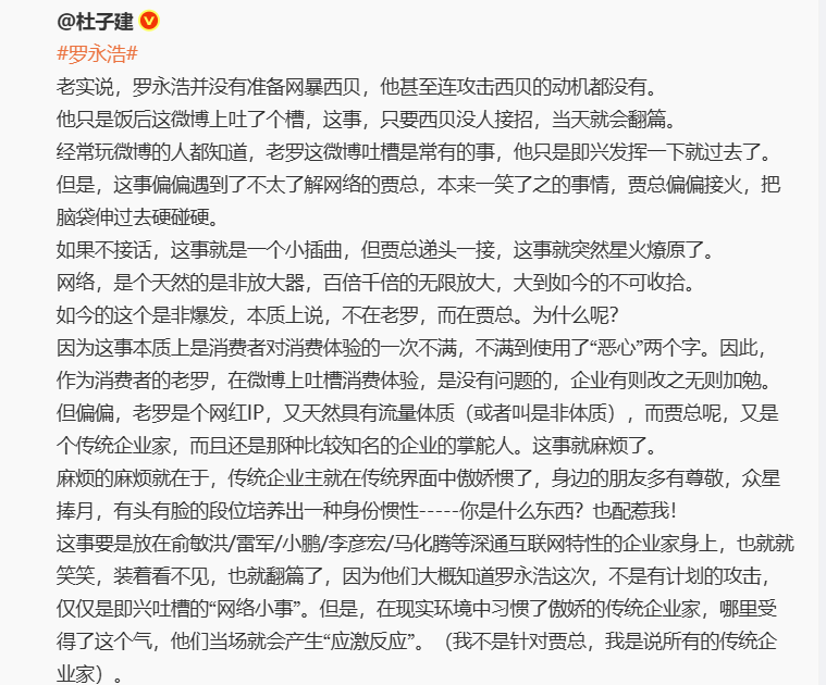 新浪微博“ 大 V” 杜子建说:“ 罗永浩并没有准备网暴西贝,他甚至连攻击西贝的动机都没有。他只是饭后在微博上吐了个槽,这事,只要西贝没人接招,当天就会翻篇。”