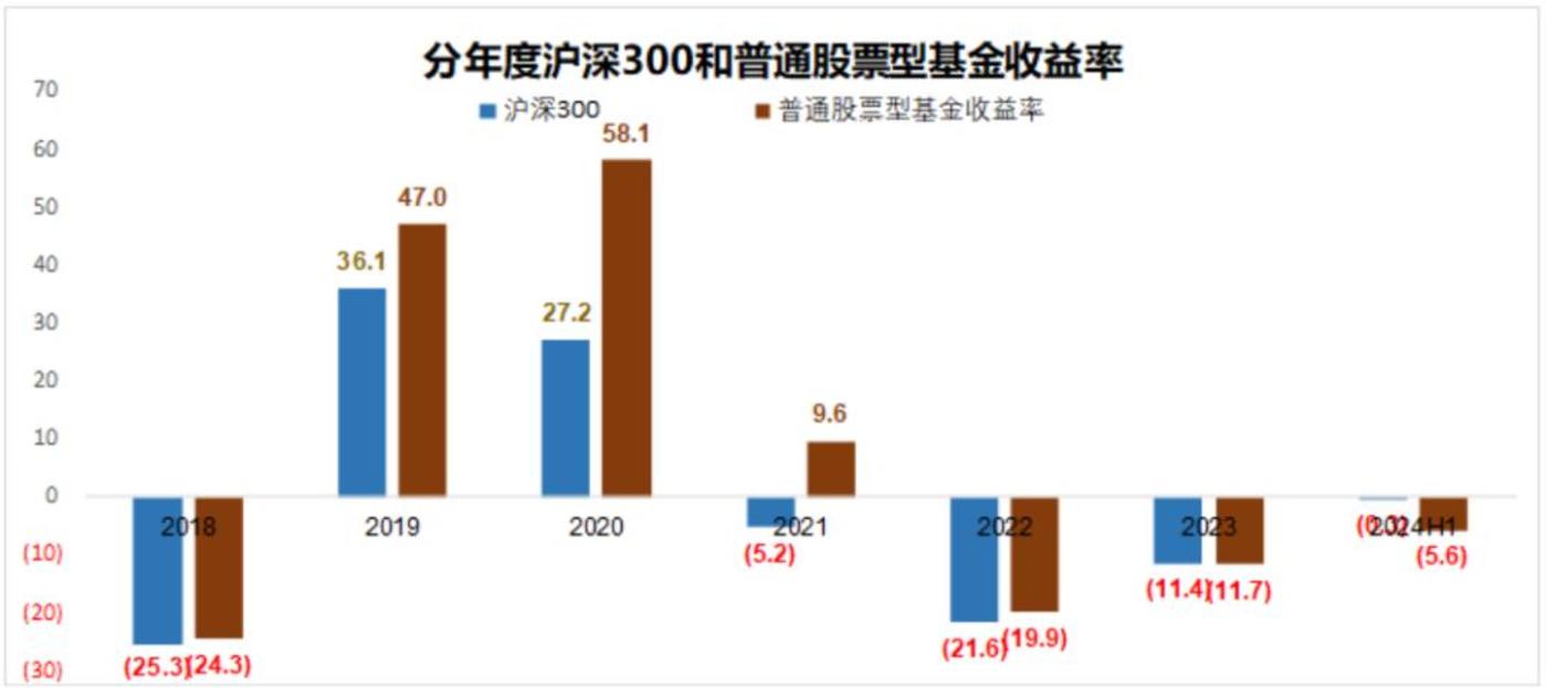 从实际数据看,2019-2021 这三年,普通的股票型基金整体收益率远远跑赢沪深 300 指数,2020 年沪深 300 指数收益率 27.2%,普通股票型基金收益率高达 58.1%。这在最近 10 年已经是妥妥的大牛市了,因为 2015 年普通股票型基金收益率也不过 47.02%。