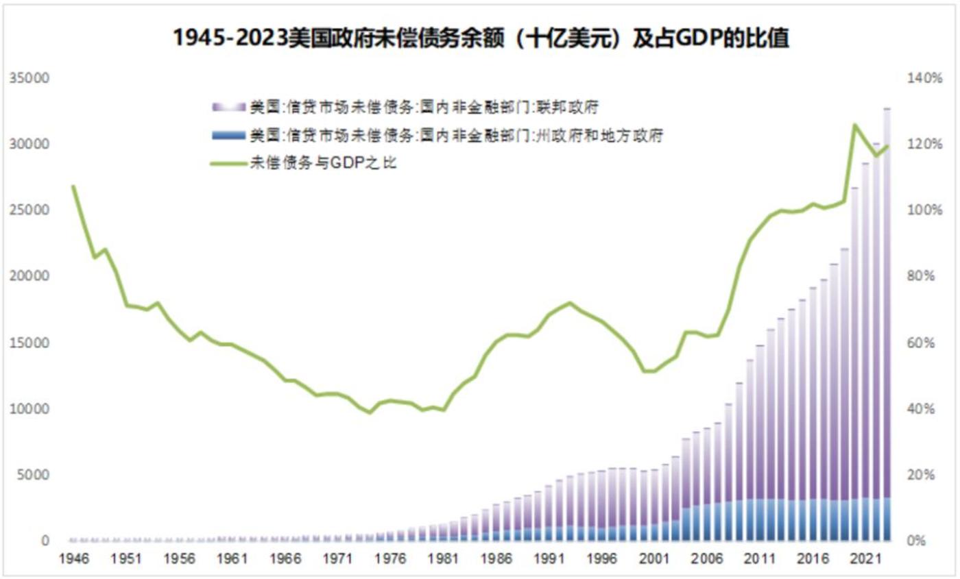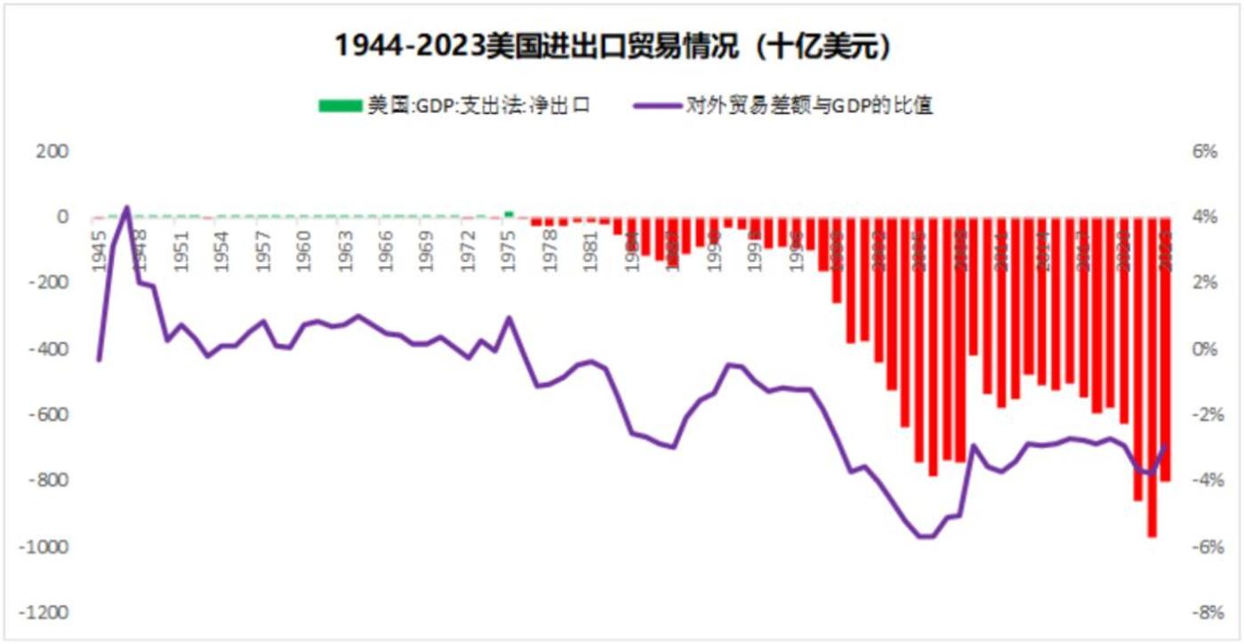 最怕的是长时间的贸易逆差形成的对外负债,这些钱一股脑回到美国本土就会让美元的世界货币功能正式成为历史。从 1945 年一直到 2023 年,美国累计的贸易逆差是多少呢?16.2 万亿美元,相当于美国 2023 年 GDP 的 60%。