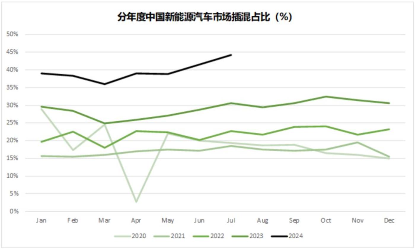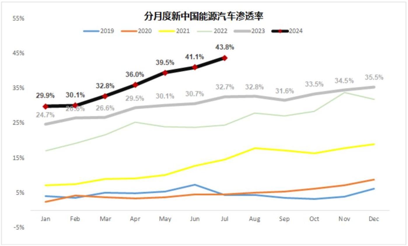 最新的汽车工业协会的数据,包括商用车在内,中国市场新能源渗透率是 43.8%,斜率明显加快。而且,按照乘联会口径的数据,乘用车中新能源的渗透率已经过半。燃油车基本上已经放弃出新款,未来的新车基本都是新能源。也就是说,2025 年我们就能看到燃油车的市占率会被压缩到 50% 以下,二手车体系,汽车经销商生态,会经历一个翻天覆地的变化。
