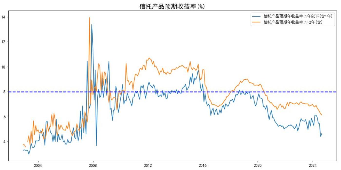 长期以来,中国资本市场的无风险利率,归根结底是要看信托产品的收益率。2018 年的陆家嘴论坛上,一位央行领导说:「收益率超过 6% 就要打问号,超过 8% 就很危险,10% 以上就要准备损失全部本金。」 可从 2008 年起,信托产品的收益率一直都是要超过 8% 的。这种情况到 2020 年起才有所改观。