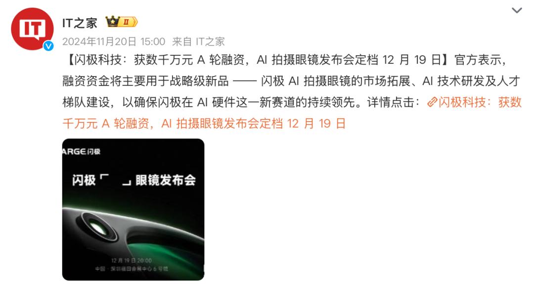 值得一提的是,在潘欣被曝加入闪极的同期,闪极宣布完成了数千万元人民币的 A 轮融资,由光远投资领投,未来光锥前沿科技基金、边缘 AI 芯片公司云天励飞跟投,融资资金主要用于闪极 AI 拍摄眼镜的项目;而此后在闪极 AI 眼镜发布会的前一日,也就是 2024 年 12 月 18 日,闪极科技再次宣布获得由绿洲资本独家投资的数千万元 A+轮融资。短短 1 个月内,闪极科技已累计完成超亿元 A 轮系列融资,资金主要用于其 AI 硬件项目。但在此之后,闪极科技至今也没有公布新的融资情况。