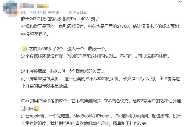 叶鑫提到的银翼 Pro,是闪极在 2024 年 5 月底推出的 140W 移动电源,也是闪极当时的主推产品,官方定价 799 元 (首发价 649 元)。然而,由于定价偏高、参数缩水等争议,银翼 Pro 上线后并未延续“ 银翼” 系列的市场热度,反而迅速跌入销量低谷。