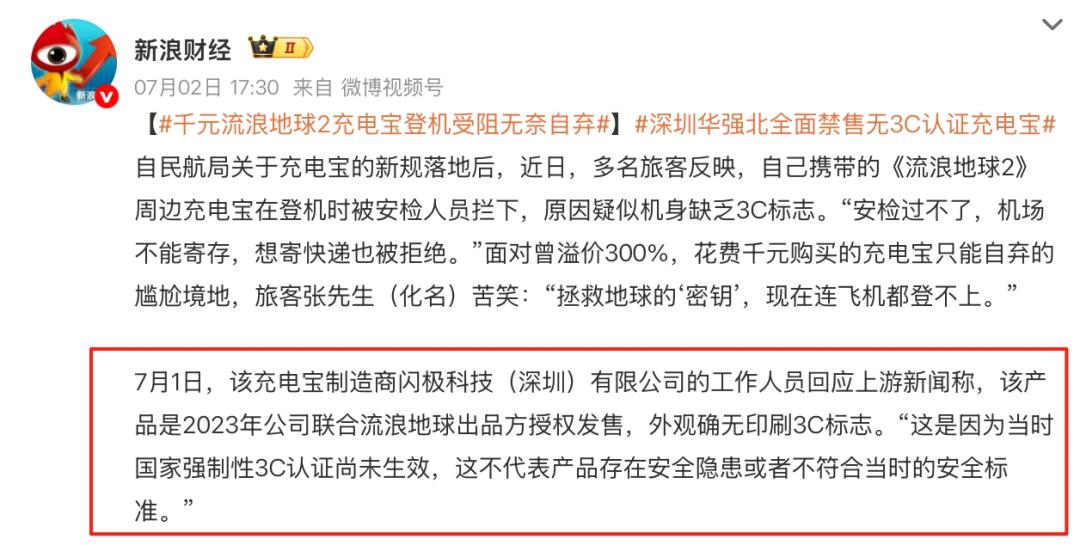 6 月 28 日,民航局实施新规要求境内航班禁止携带无 3C 标识、标识不清或属于召回批次的移动电源后,有多位旅客反映自己携带的 《流浪地球 2》 周边充电宝在登机时被安检人员拦下,原因是机身缺乏 3C 标识。