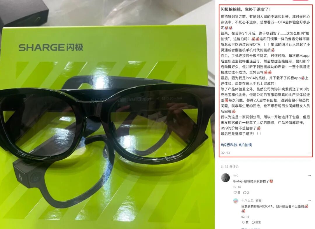 而收到货的用户的体验评价也是参差不齐。有小红书用户表示在苦等了几个月后,终于等到了闪极 AI 眼镜的收货通知,但当体验完产品后发现,在拍照质量、连接信号以及语音识别等方面都有问题。有用户吐槽“ 摄像画质像行车记录仪”“ 蓝牙通话用不了”“ 语音识别断断续续” 等吐槽层出不穷,甚至有用户直言“ 闪极 AI 眼镜目前用下来就是一个半成品!”