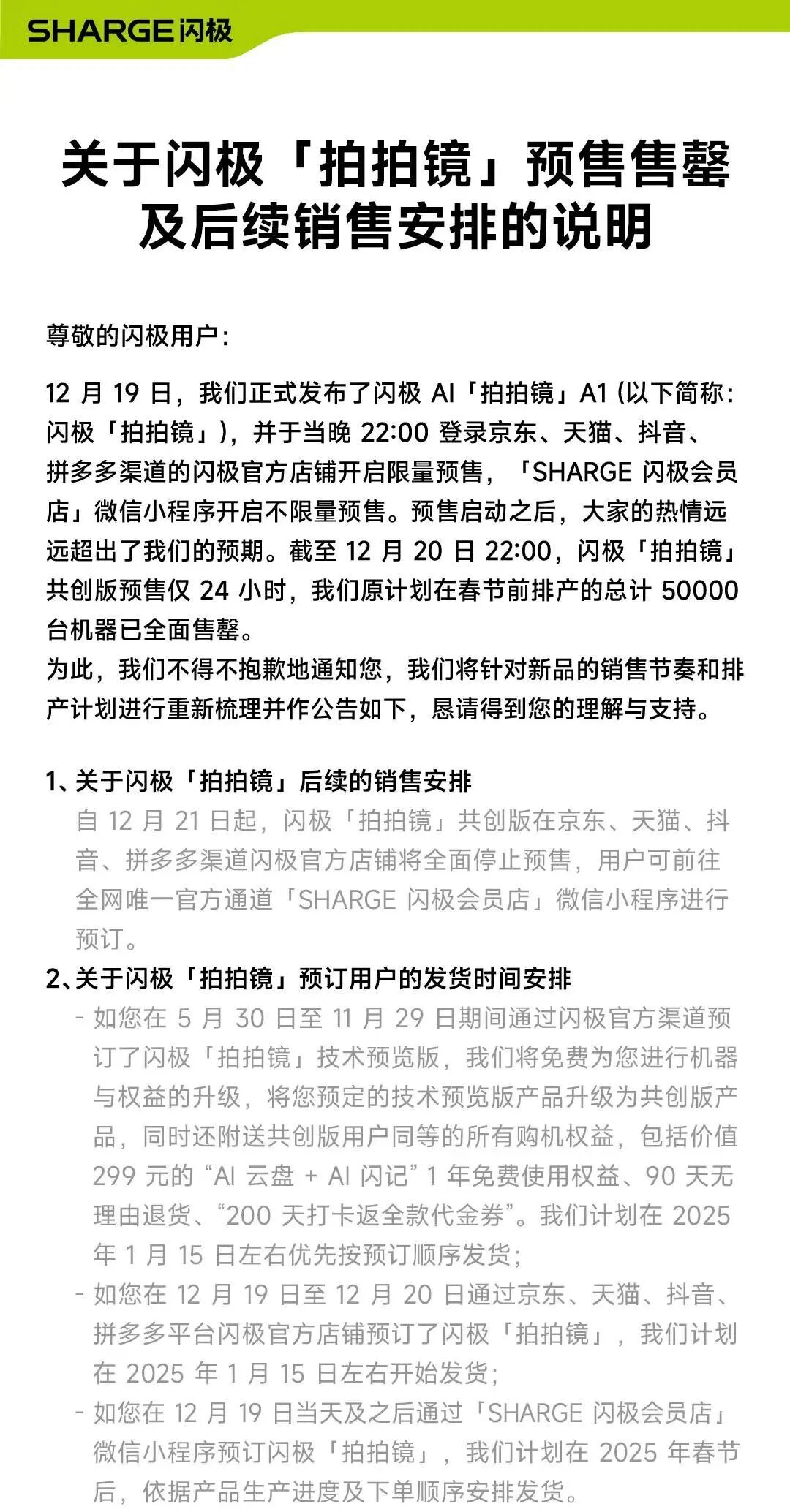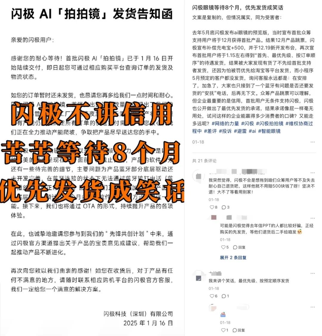 然而直到 2025 年 1 月下旬,多位最早预定的用户仍未收到产品,却发现部分通过天猫、小程序等渠道下单的新用户已经有人到货;对此,闪极的回应是“ 系统问题、批次差异”,但用户并不买账。