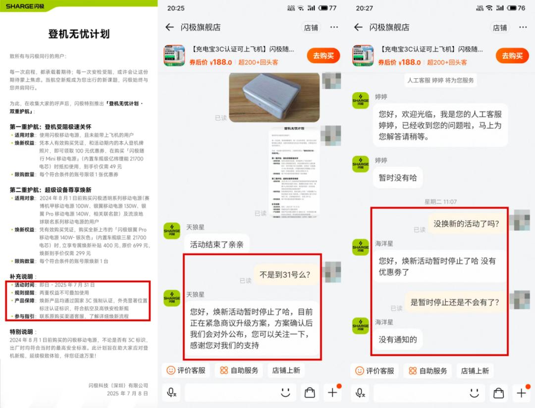 原本这一计划是为了缓解用户焦虑、挽回信任,并顺势推动产品转化,但这场活动的“ 温度” 并未持续太久。有购买闪极充电宝的老用户抱怨称,“ 闪极推出的登机无忧活动时间写的明明是截至 7 月 31 日,但我在活动结束前询问客服,却被告知活动暂停,官方也没有明确解释原因,整个过程既不透明,也不尊重用户,搞得我自己只能按市场价格购买。” 此外,社媒平台上还有闪极老用户质疑闪极这波活动是在借机清库存。