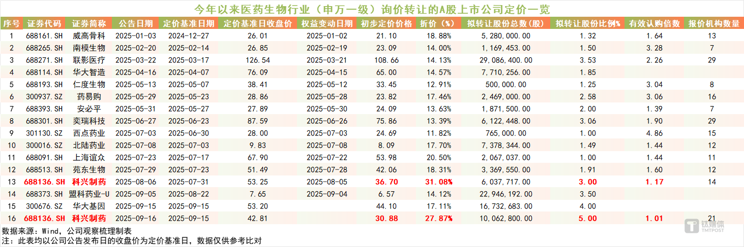 再看今年以来,A 股医药生物行业 (申万一级) 已发生的 16 起询价转让案例。