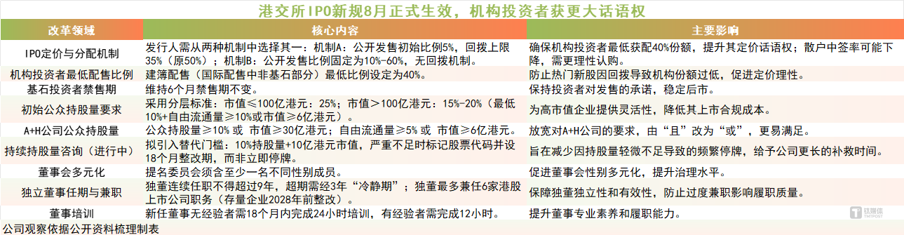 今年 8 月初,港交所正式实施的优化后的 IPO 市场新规,也特别强调了“ 提升机构投资者在 IPO 定价中的话语权”,确保定价合理性及后市稳定。新规主要涉及配售比例调整、回拨机制优化及公众持股要求修订,被视为港交所自上世纪 90 年代以来对 IPO 制度的最大调整。