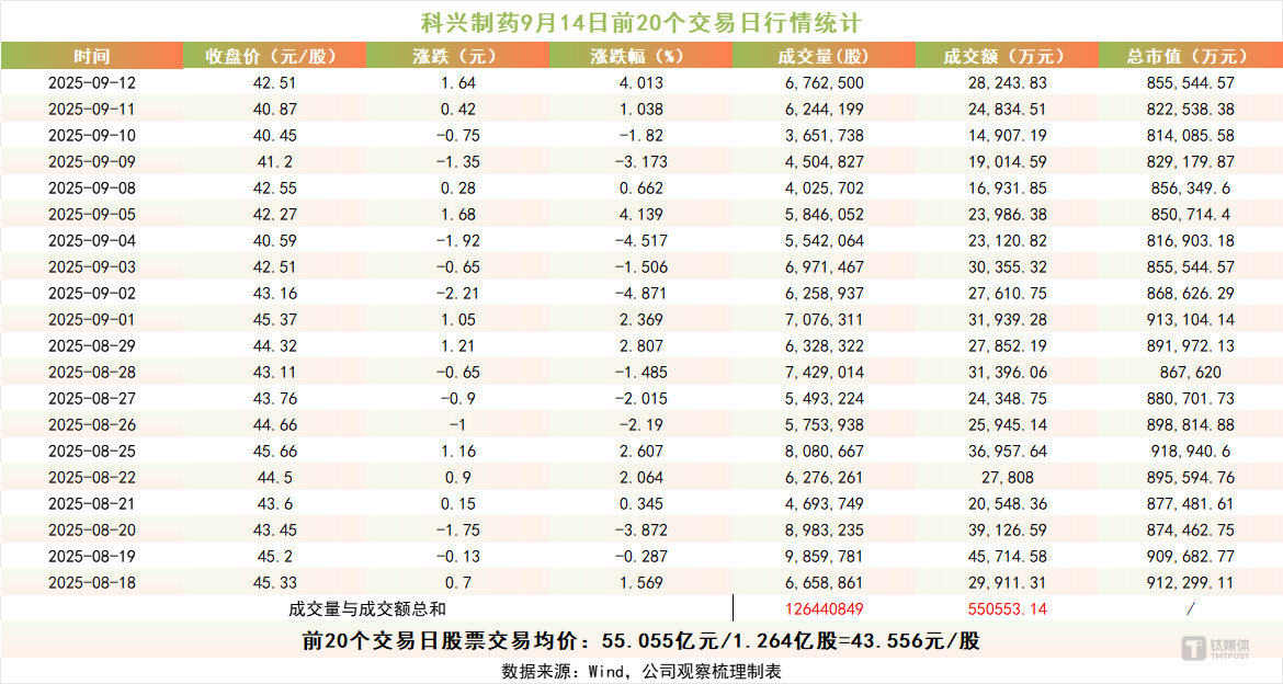 笔者以 9 月 14 日 (周日) 股东发布询价转让计划前的最后一个交易日为基准,向前追溯 20 个交易日计算,科兴制药的“20 日均价” 为 43.556 元/股,对应的转让价格下限为 30.489 元/股。而本轮转让最终定价为 30.88 元/股,几乎贴近拟定下限,相当于在定价基准上让利约 29.1%。