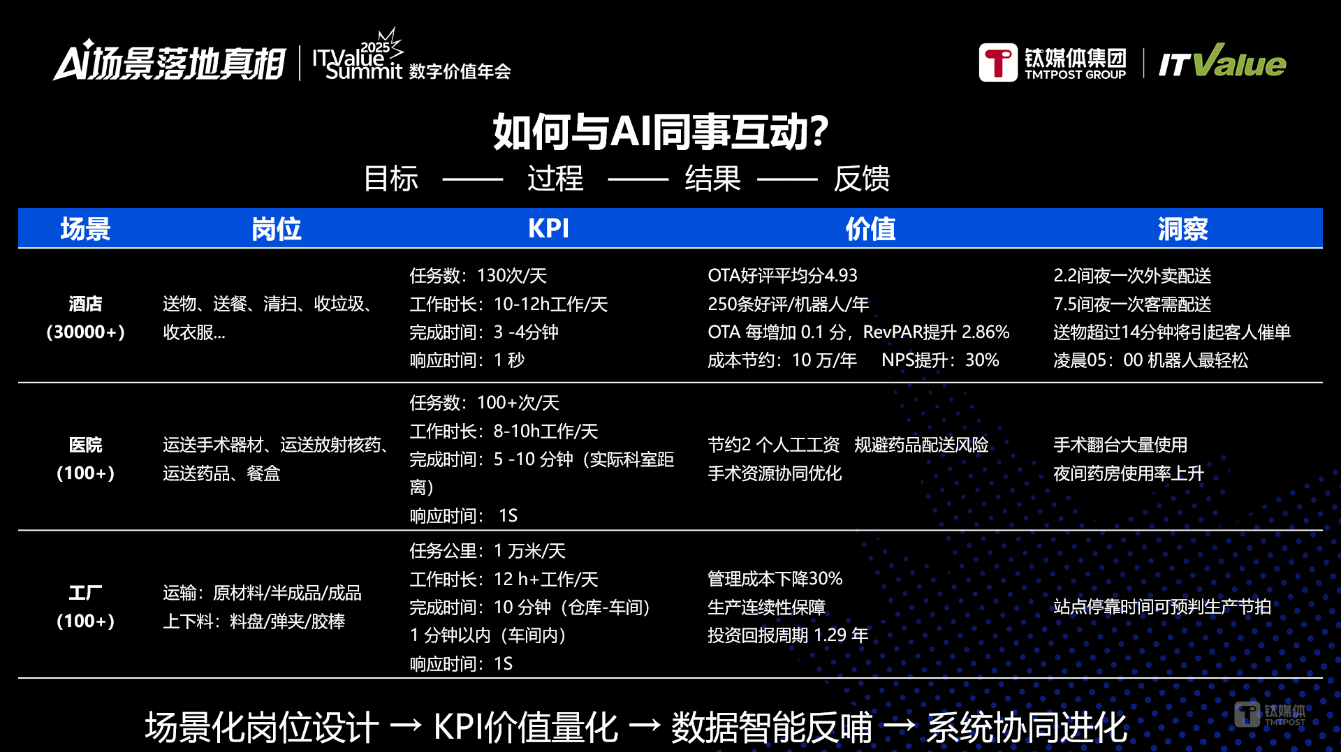 大家如何在日常工作中和这些“AI 同事” 高效协同工作,谢云鹏也给出了答案—— 与 AI 机器人同事高效协作,需聚焦四大关键:目标明确、过程可控、结果可溯、反馈必应。以云迹科技机器人为例,酒店管理者不仅为其设定工作时长、响应时间等清晰 KPI,更从运行数据中敏锐识别细微的客户需求,借助持续反馈推动系统优化。每一次精准服务都不只提升运营效率,更转化为实实在在的价值增量,助力酒店赢得更多好评。这样的人机协作模式,同样适用于医院、工厂等多种场景,赋能更多行业实现智能升级与体验提升。