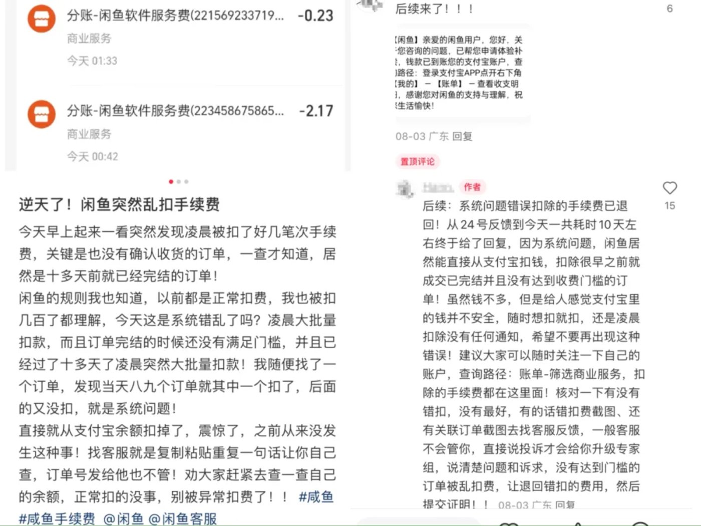 值得一提的是,有卖家提到自己在近期突然被闲鱼乱扣手续费的情况,「闲鱼的规则我也知道,以前都是正常扣费,今天是系统错乱了吗?」 并表示 「是凌晨大批量扣款,都是很早之前就成交已完结并且没有达到收费门槛的订单。」 而这件事的后续是,闲鱼给出回复并退回误扣的手续费。