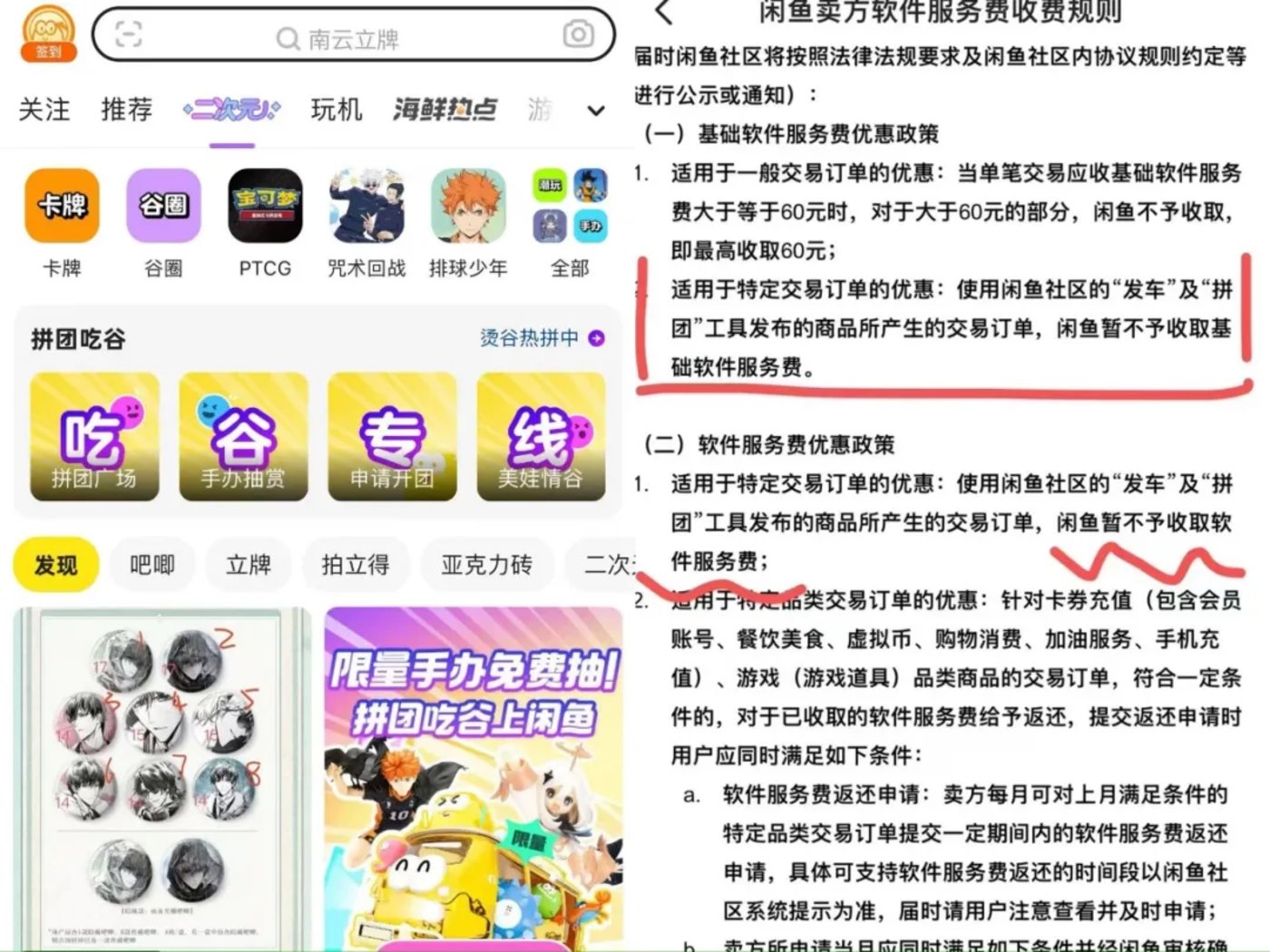 回首近两年闲鱼之变,自从 2022 年季山上任,就给闲鱼定下了 「社区」+「交易」 双轮驱动的战略。2023 年 5 月,闲鱼更是升级了 「海鲜市场」 和 「会玩」 社区,想靠着一群兴趣达人来巩固用户之间的 「江湖情谊」。如果说收取服务费是为了盘活已成形的 「聚宝盆」,那对二次元交易等特定交易 「网开一面」 则或许不仅是为了提升新的造血能力,也是为了留一条退路——让商业化更快一步,也尽量保证社区的调性。